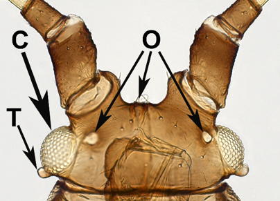 A section of the compound eye, consisting of a cluster of three ommatidia, on each side of the head. In most adults, it is located on an ocular tubercle. Occasionally in apterae and immatures, the main part of the compound eye is absent and only the triommatidium is present.