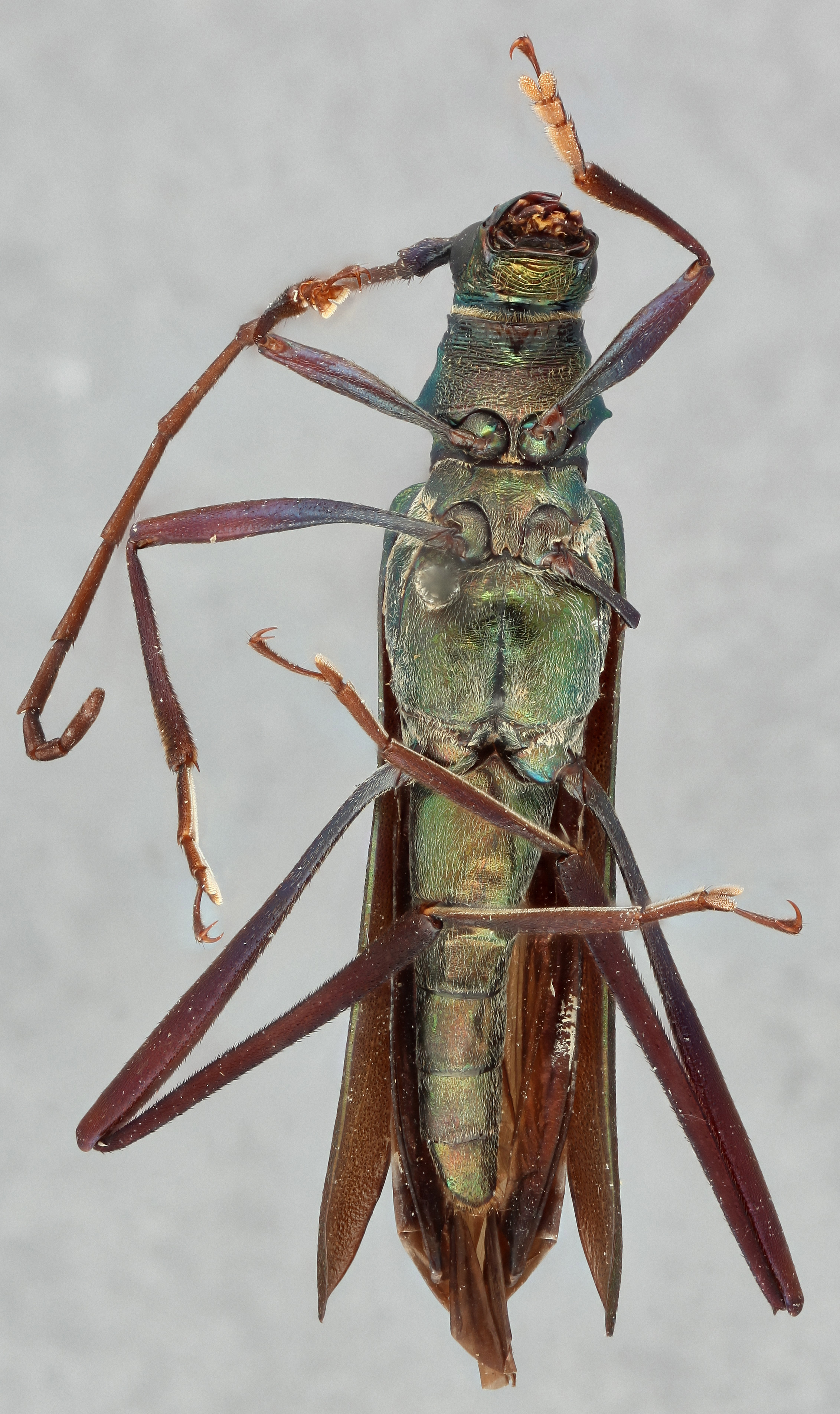 . Legs very long, slender; hind femora extend beyond elytral apices (Cherepanov 1988bCherepanov 1988b: