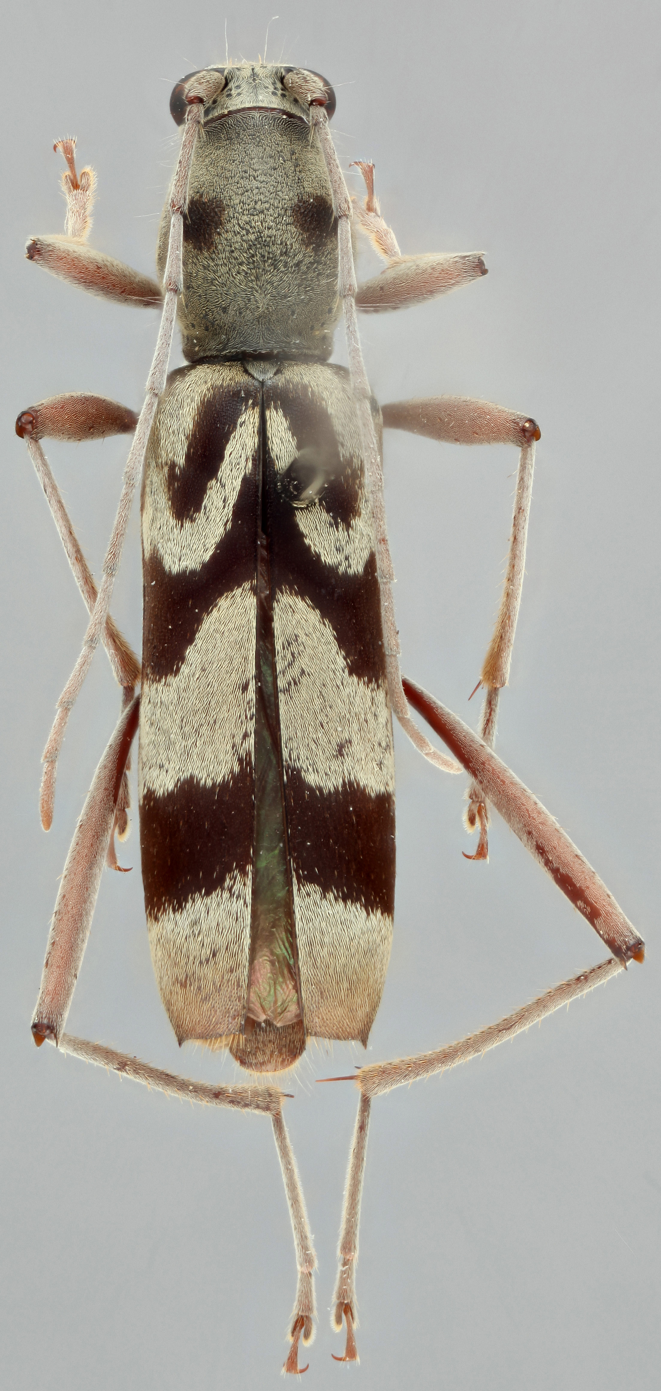 narrow, at least four times as long as broad. First posterior tarsal segment much longer than remaining segments combined , generally twice as long, but at least one-half again as long. Antennaeantenna: