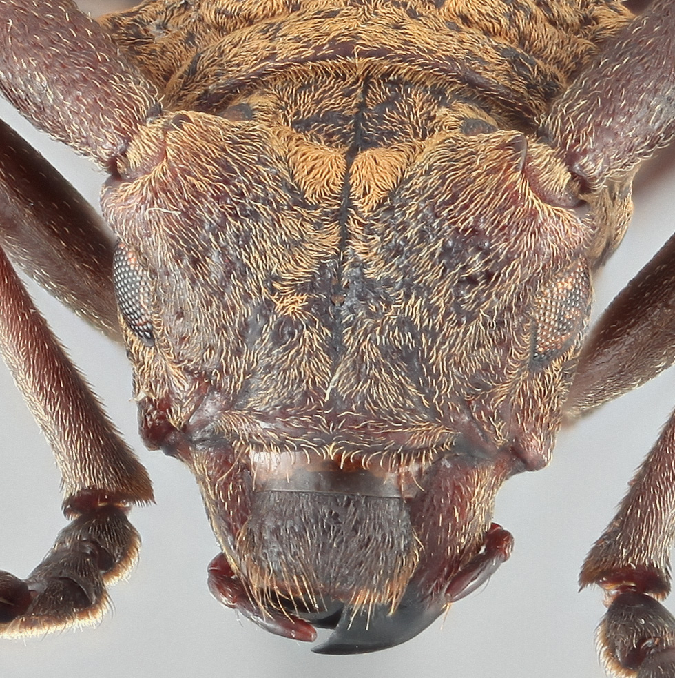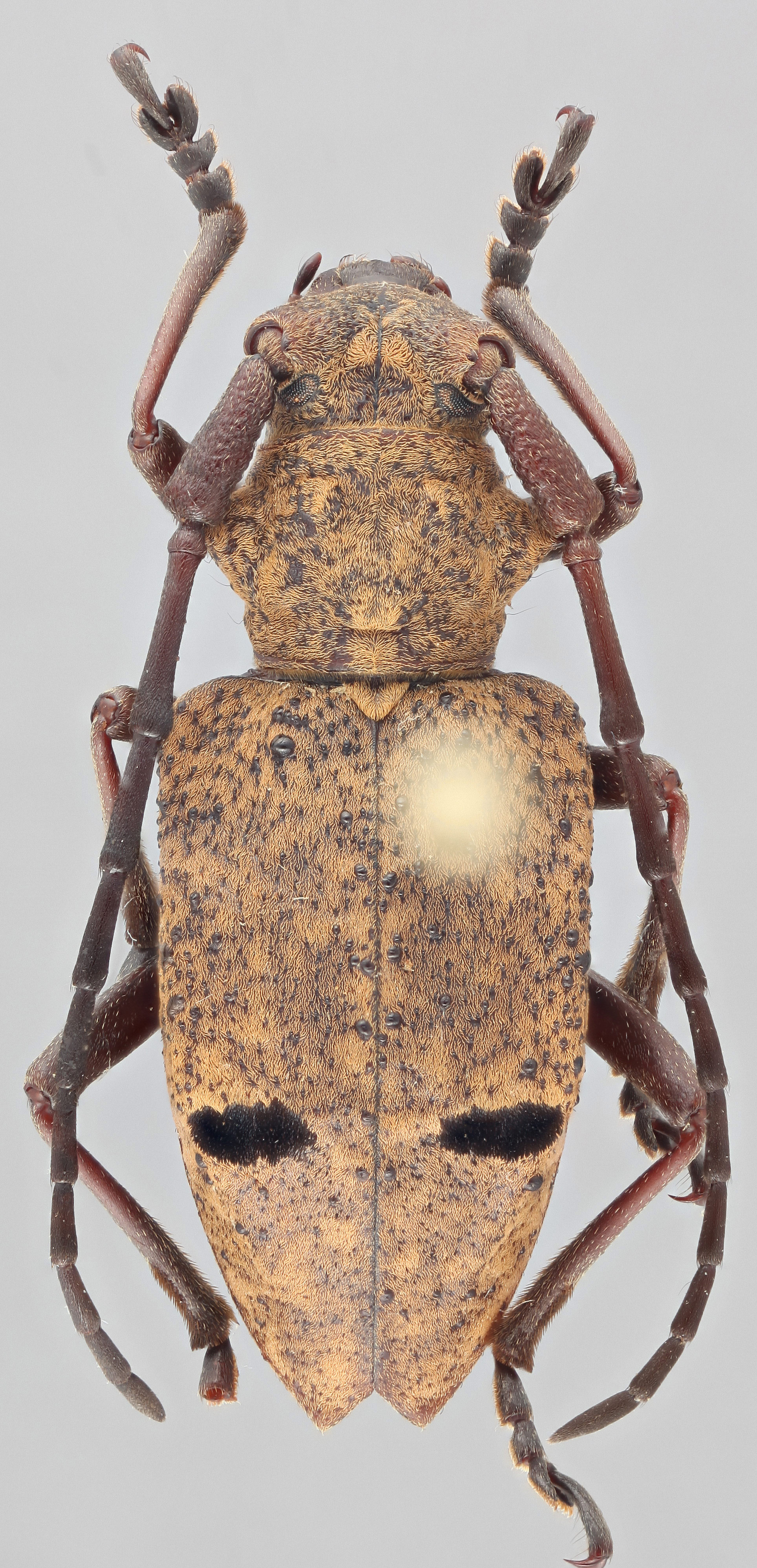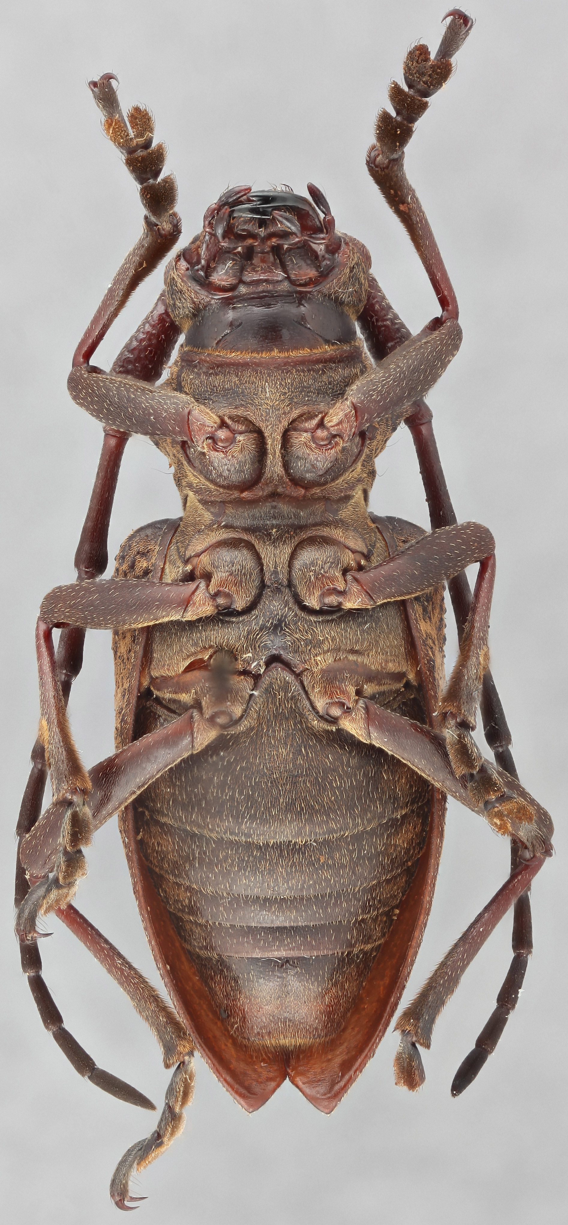 is a large, smooth, raised granule. Non-retractable head. Narrow prosternal projection, less high than the coxae, regularly arched; mesosternal protrusion rounded forward. Very short metasternum. Atrophied wings. Legs fairly long, thin; linear femurs (adapted from Breuning 1950Breuning 1950:
