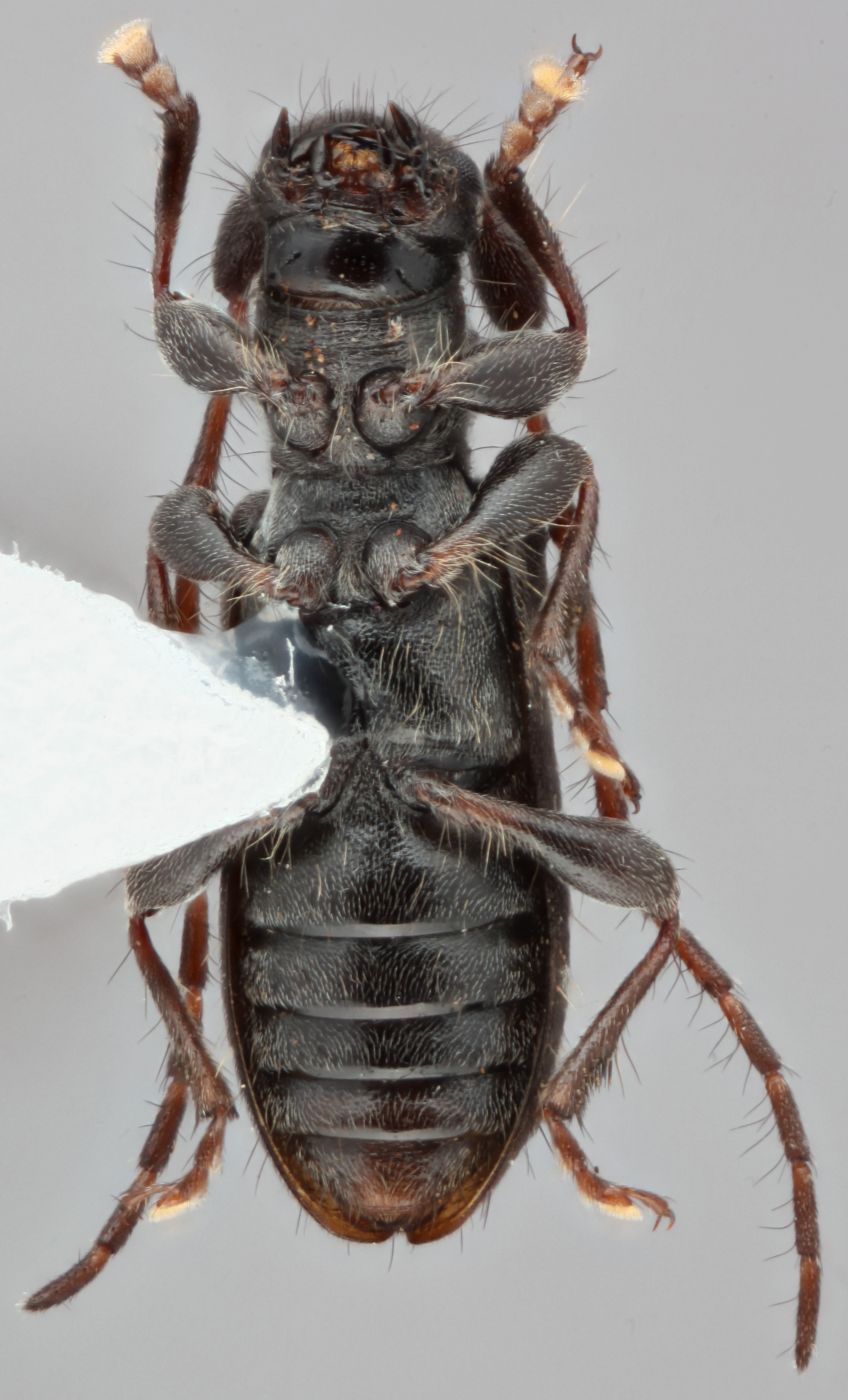 with long erect hairs, almost same as long as third; third segment more or less shorter than fourth; underside of second to the last segment provided with long erect hairs. Pronotumpronotum: