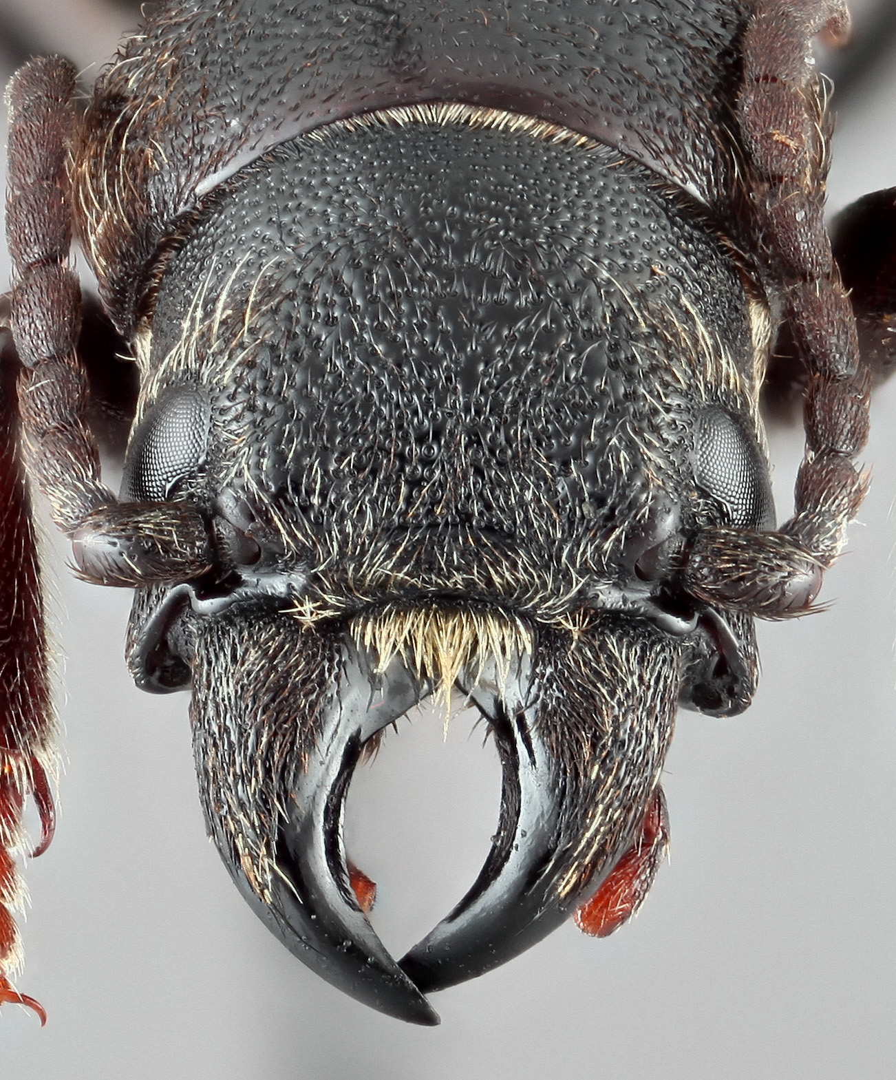 ; mandibles shorter than head, cutting edge with a basal tooth; second segment of maxillary palpi slightly shorter than third; galea transversetransverse: