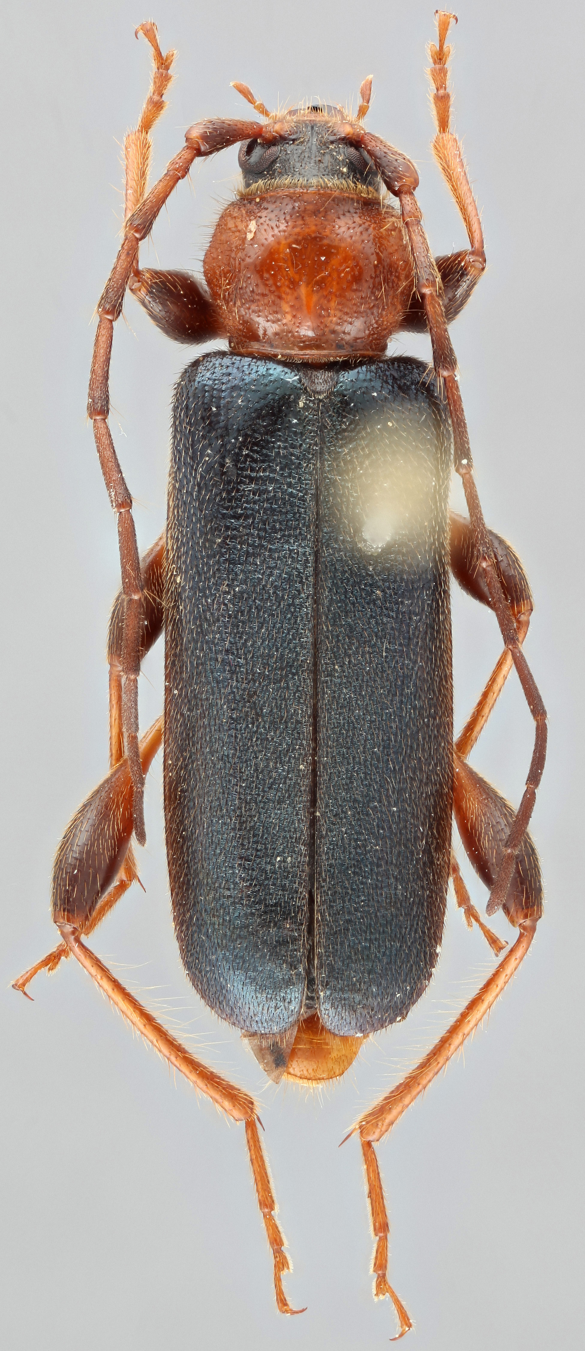 . It can be differentiated from Callidium by the presence of a stridulatum and no large punctures on the mesonotum. Eumichthus looks similar but differs from Phymatodes by the second antennal segment more than twice as long as wide/about half as long as third, the final palpal segment triangularly dilated, and the male with the proleg tarsomerestarsomere: