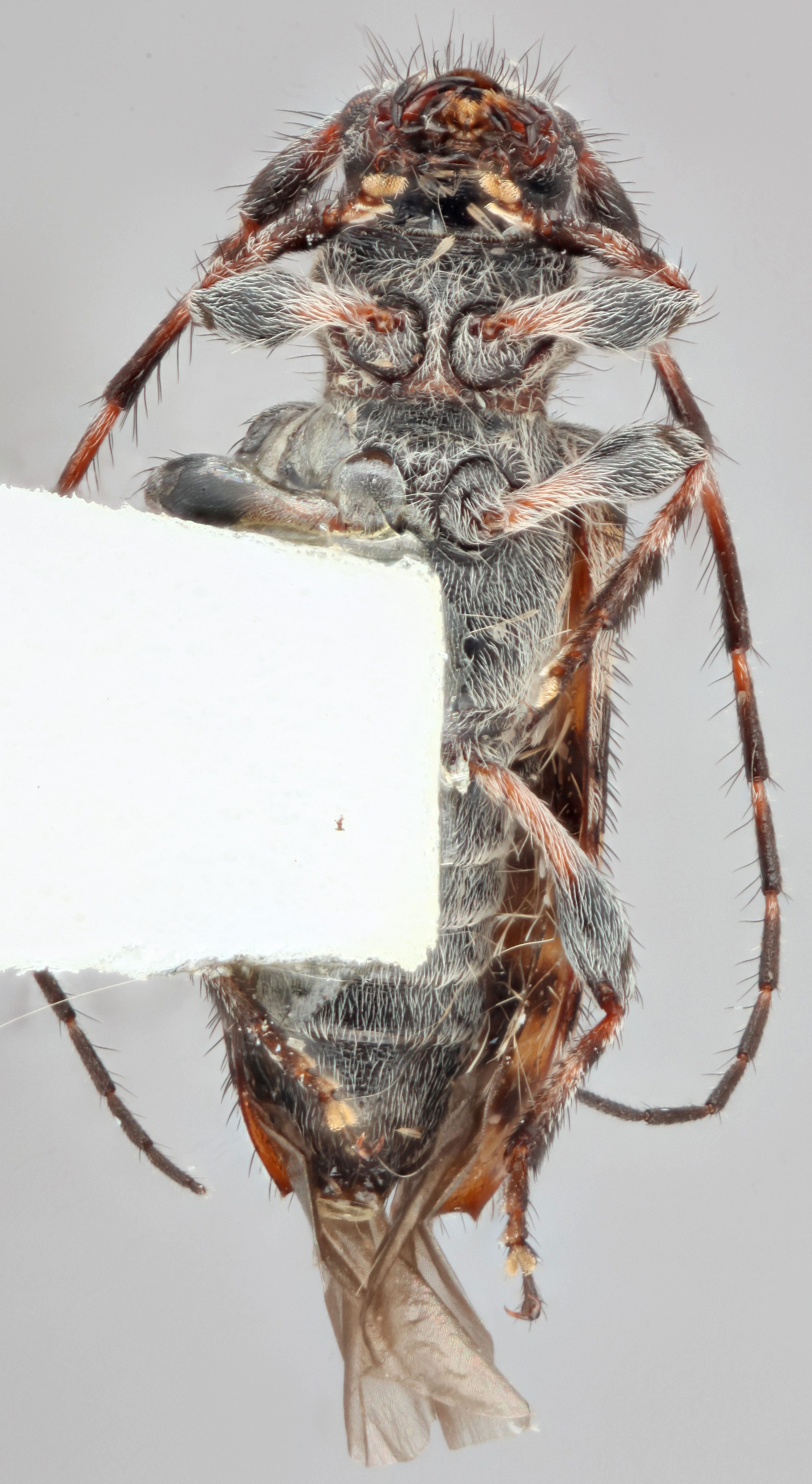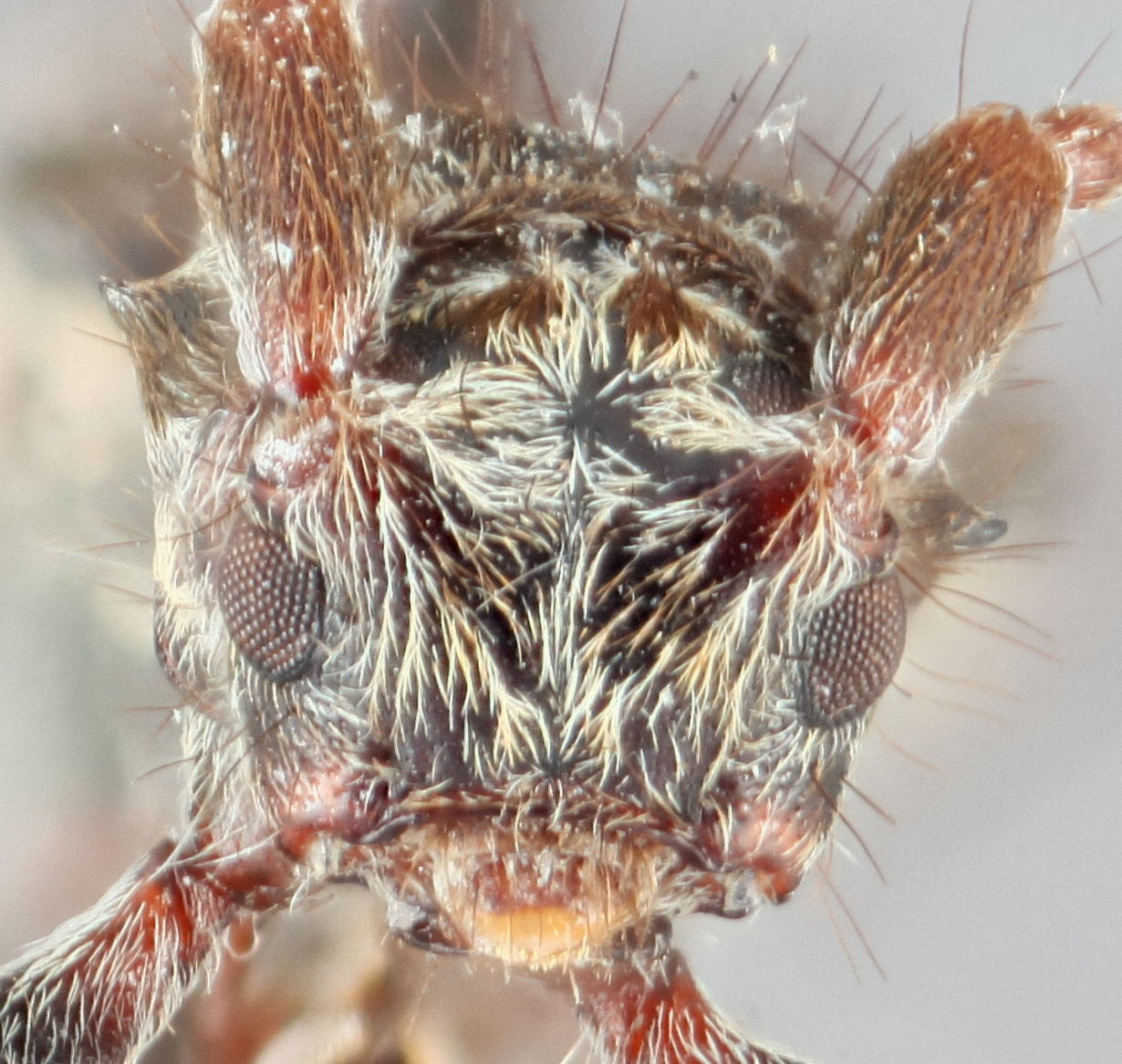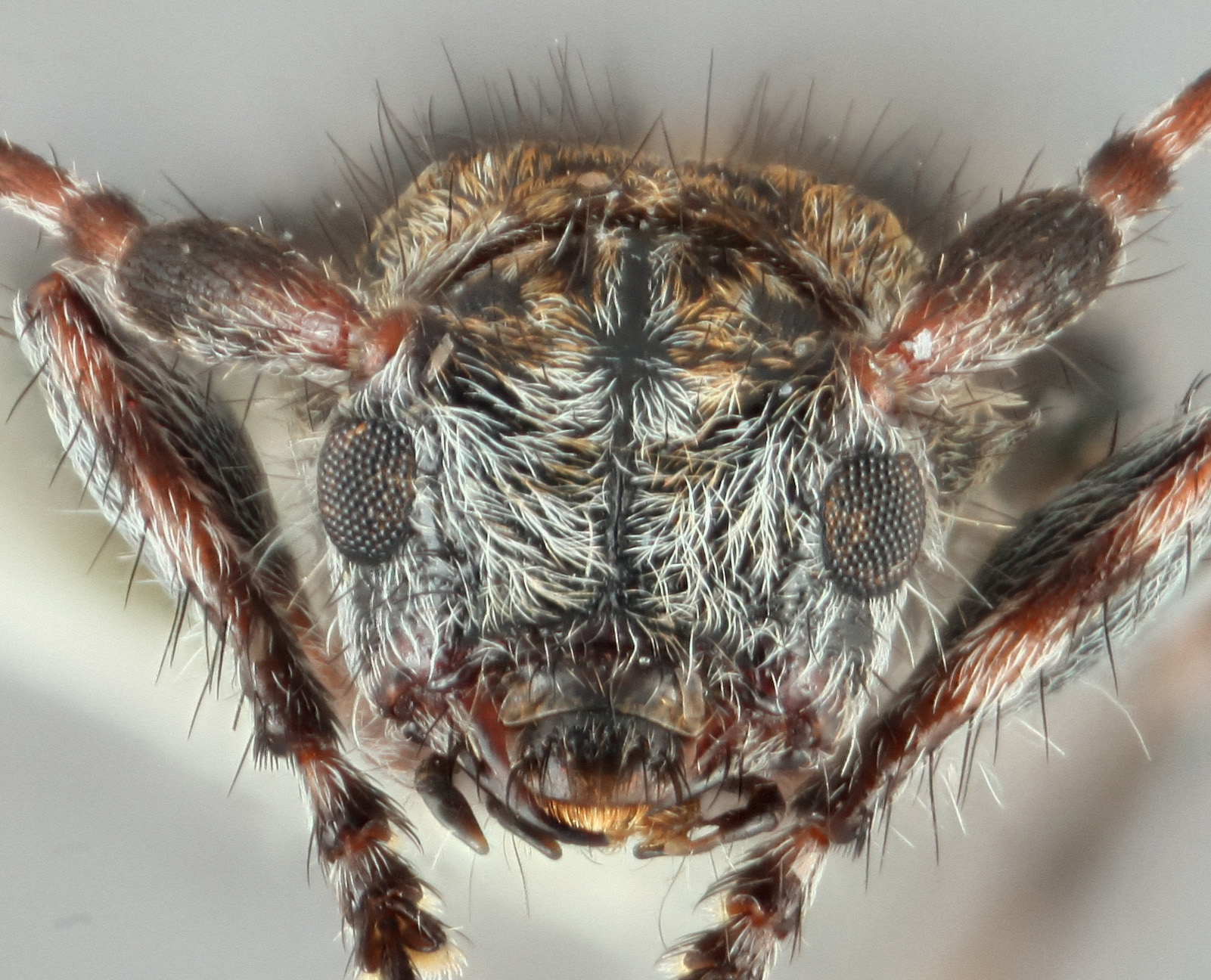 Body robust, subcylindrical, clothed with a short recumbent pubescence intermixed with long flying hairs. Head large, strongly concave between the antennal insertions; antennaeantenna: