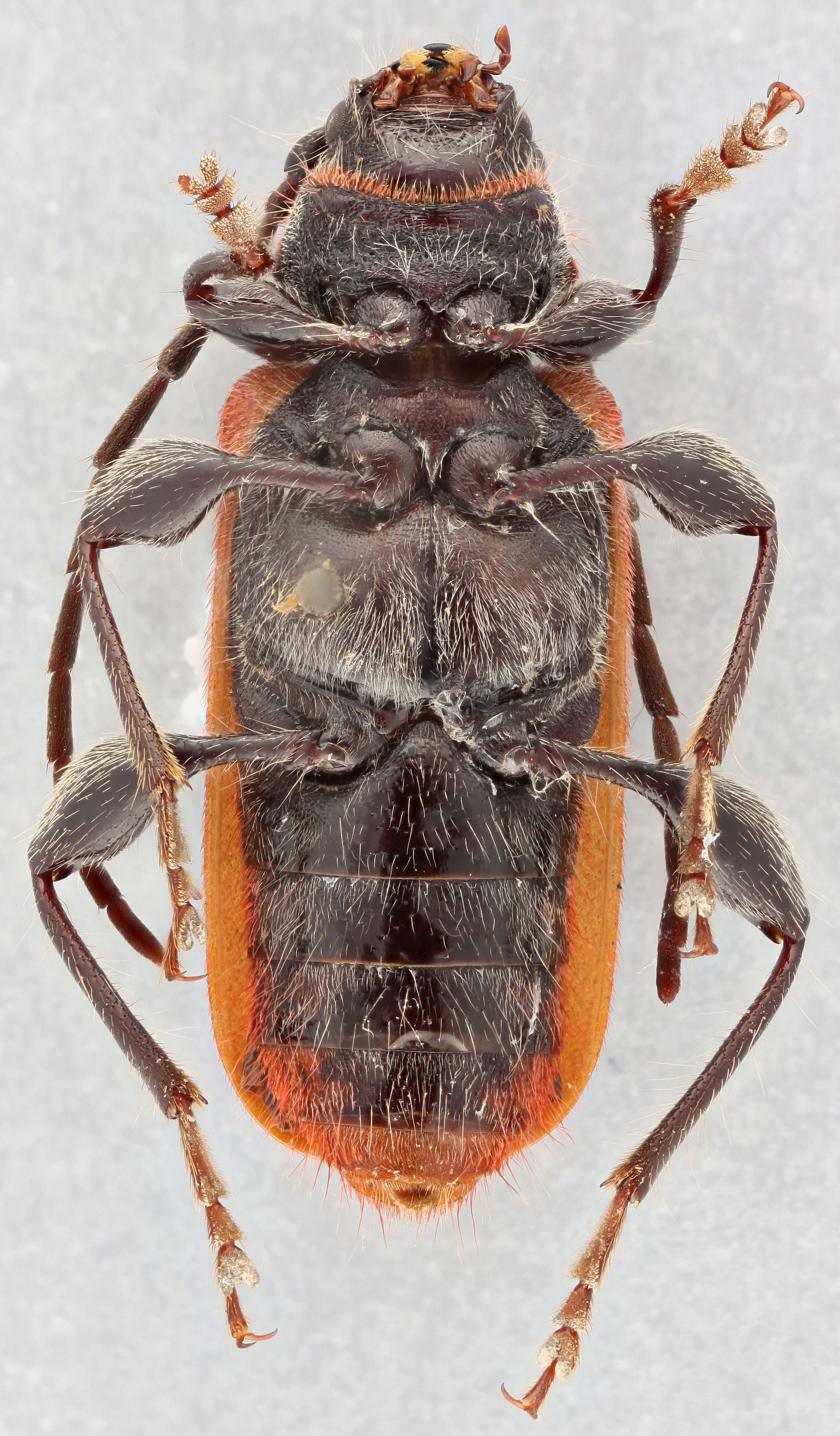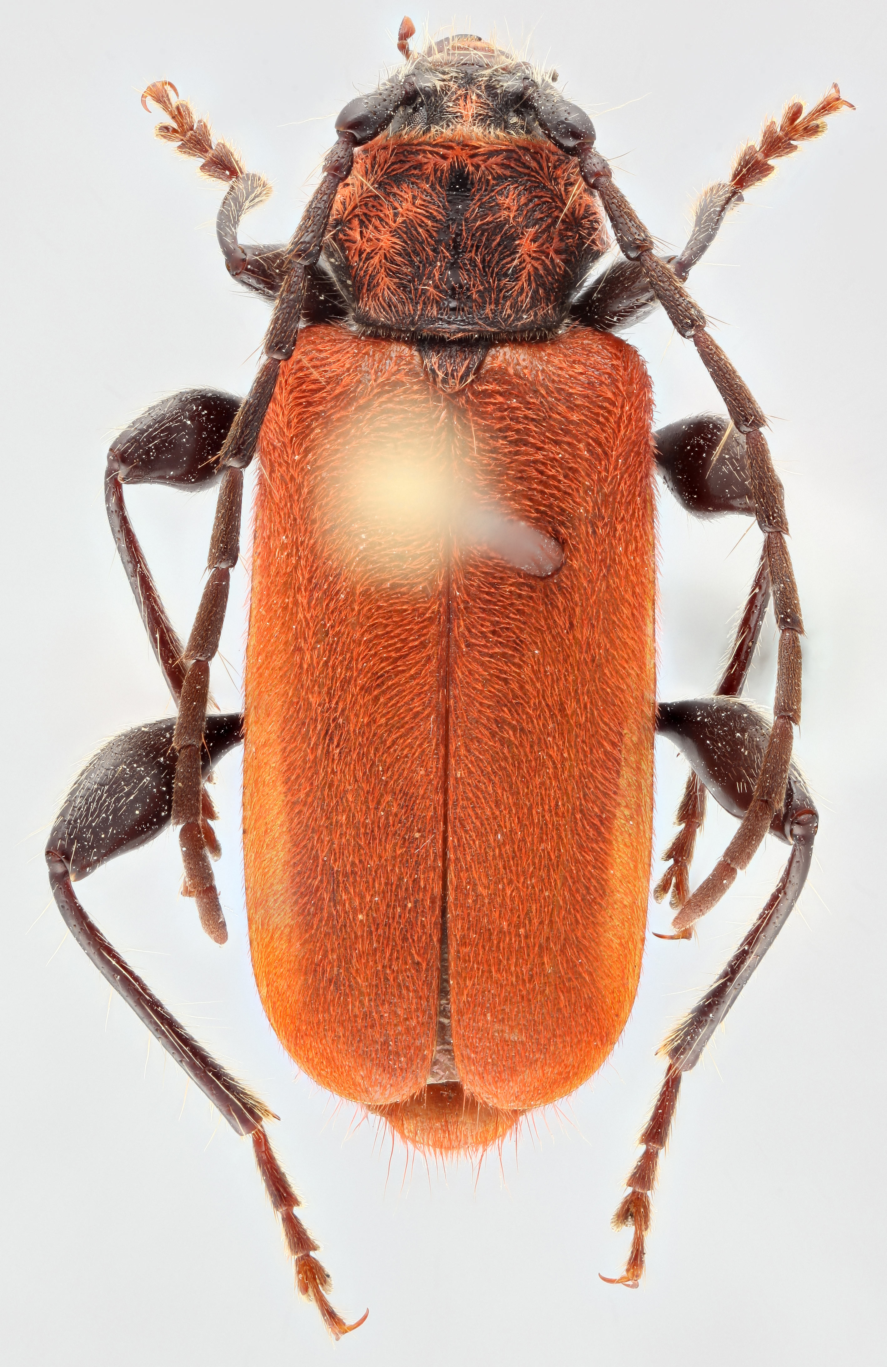 The bright red-orange pubescence on the pronotumpronotum: