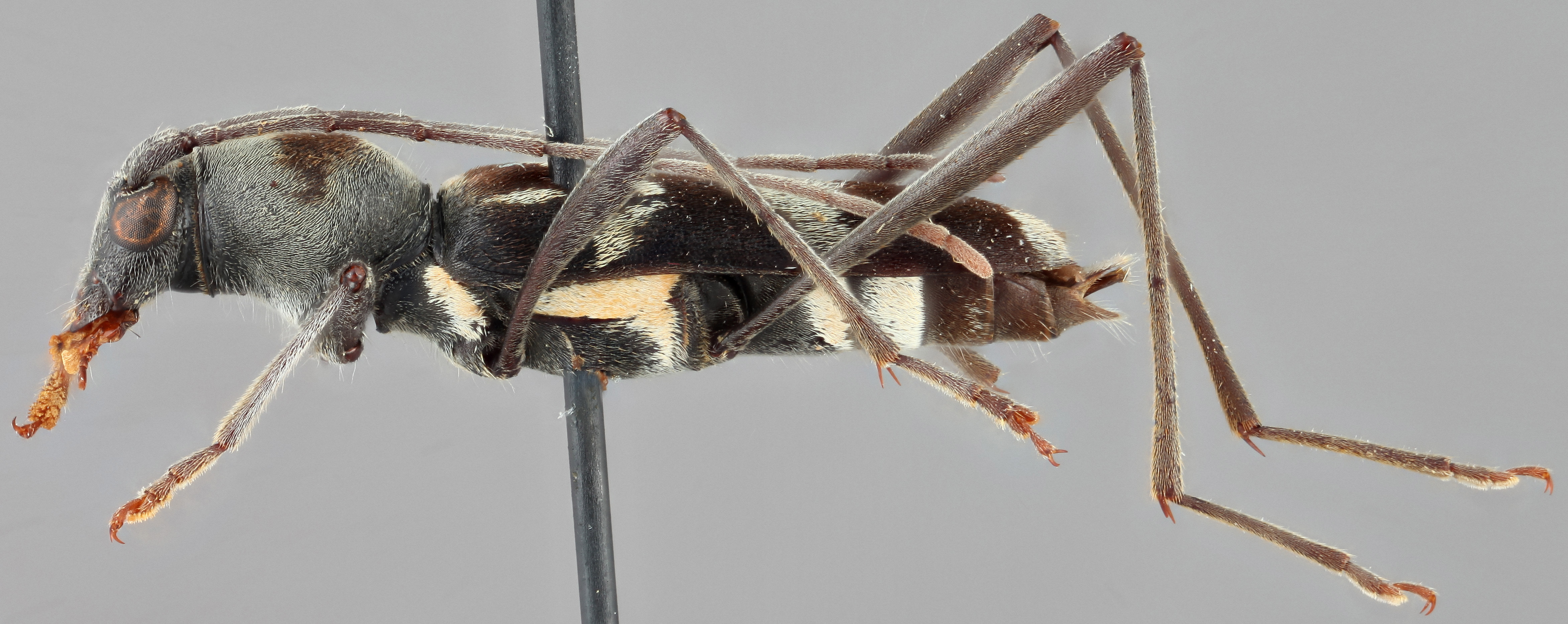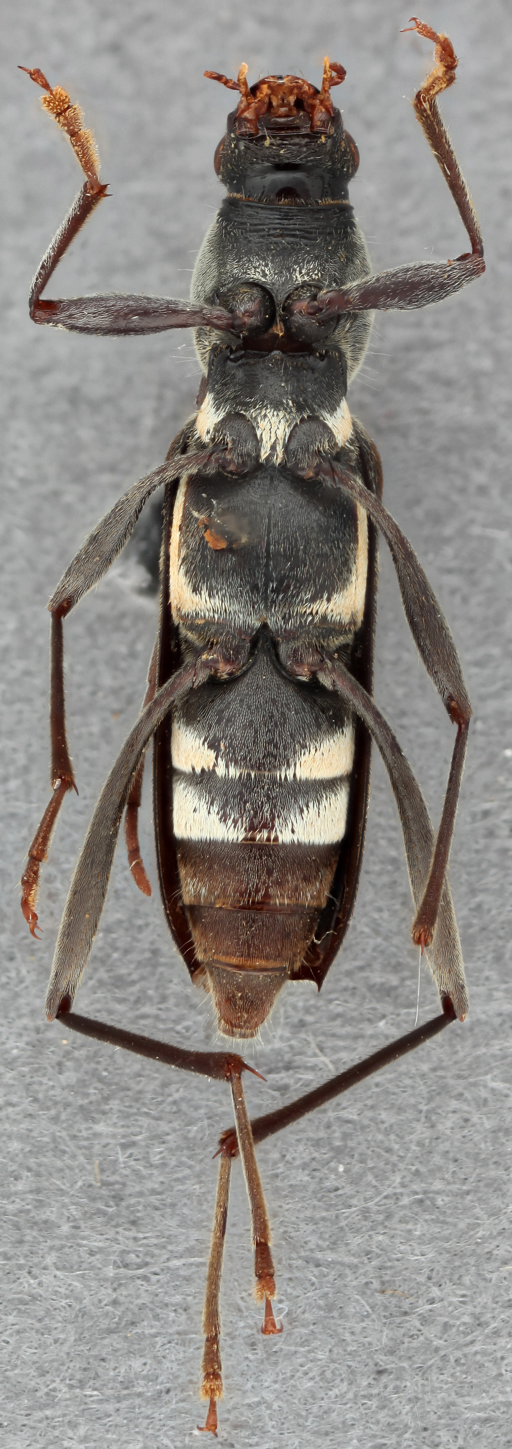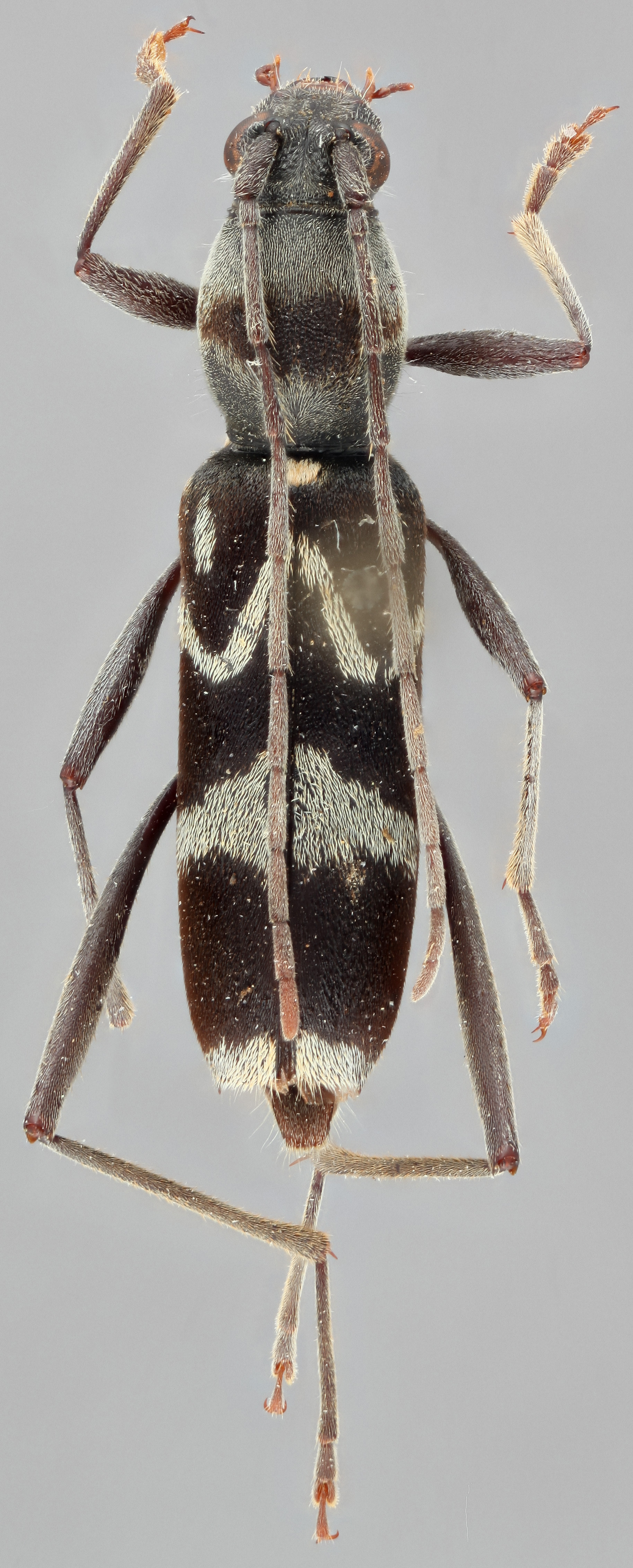 , and produced under angle; covered with light-colored adherent hairs forming characteristic pattern of longitudinal oblique bands (stripes). Legs very long, slender; hind femora reach or slightly short of elytral apexapex: