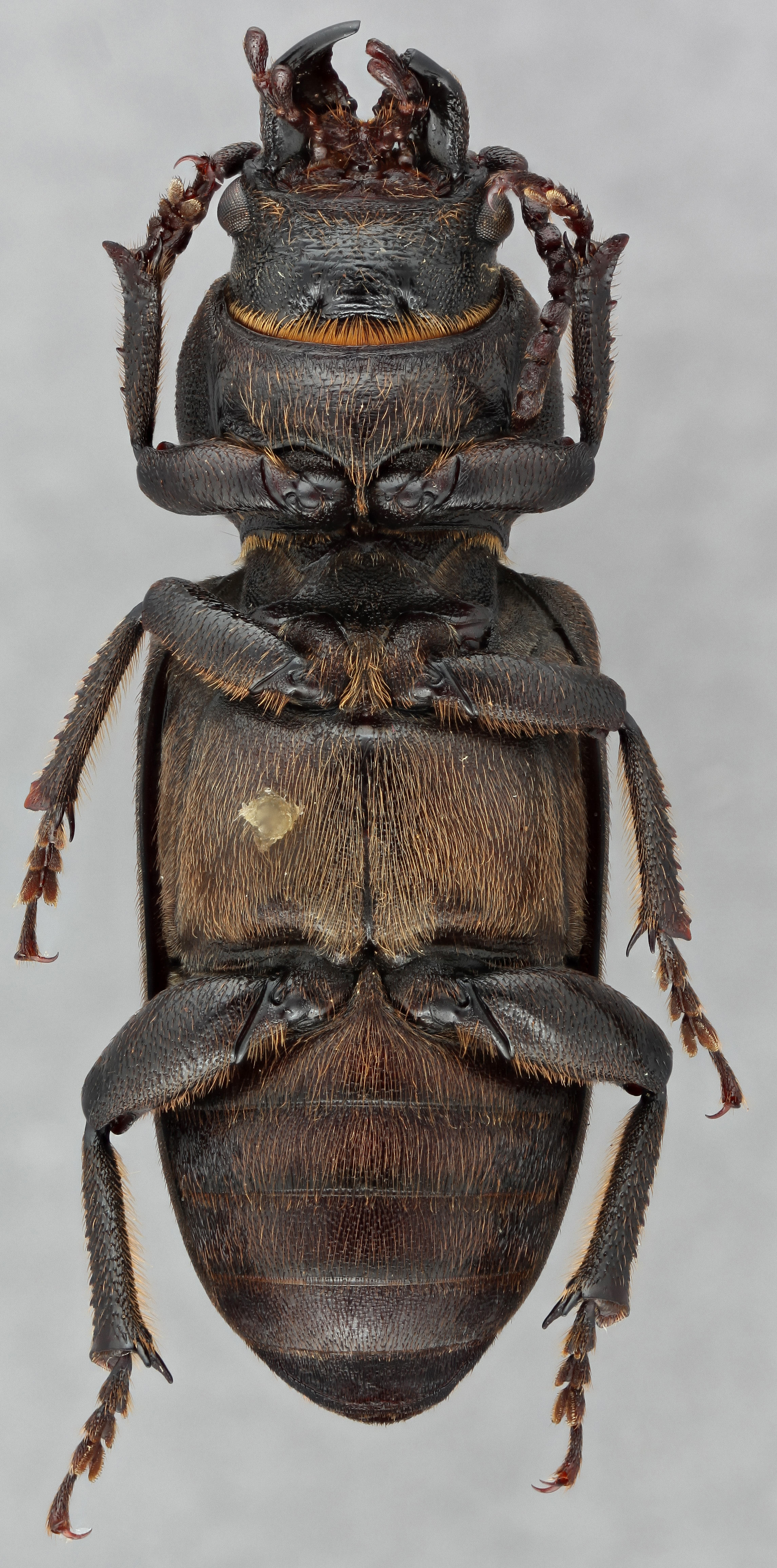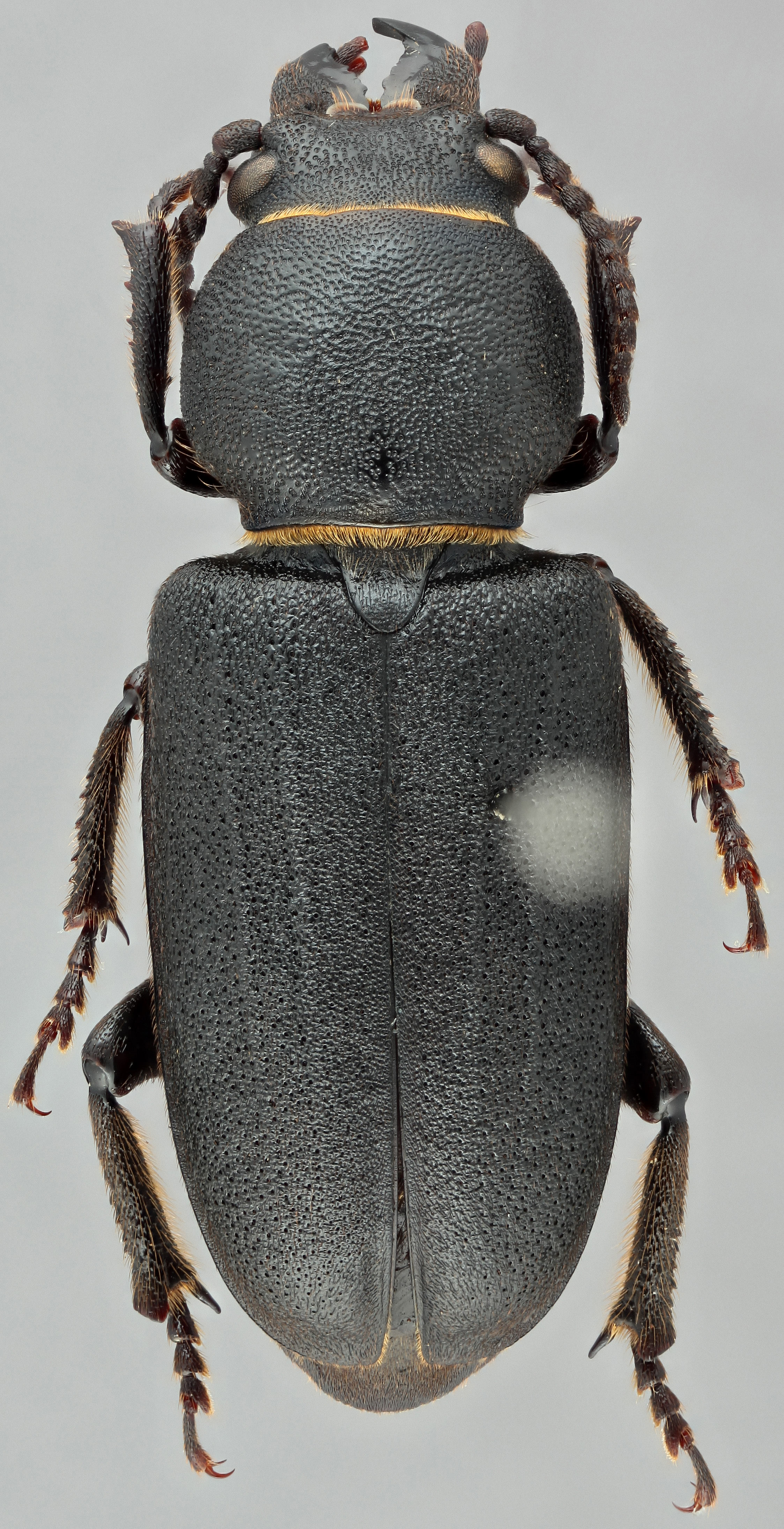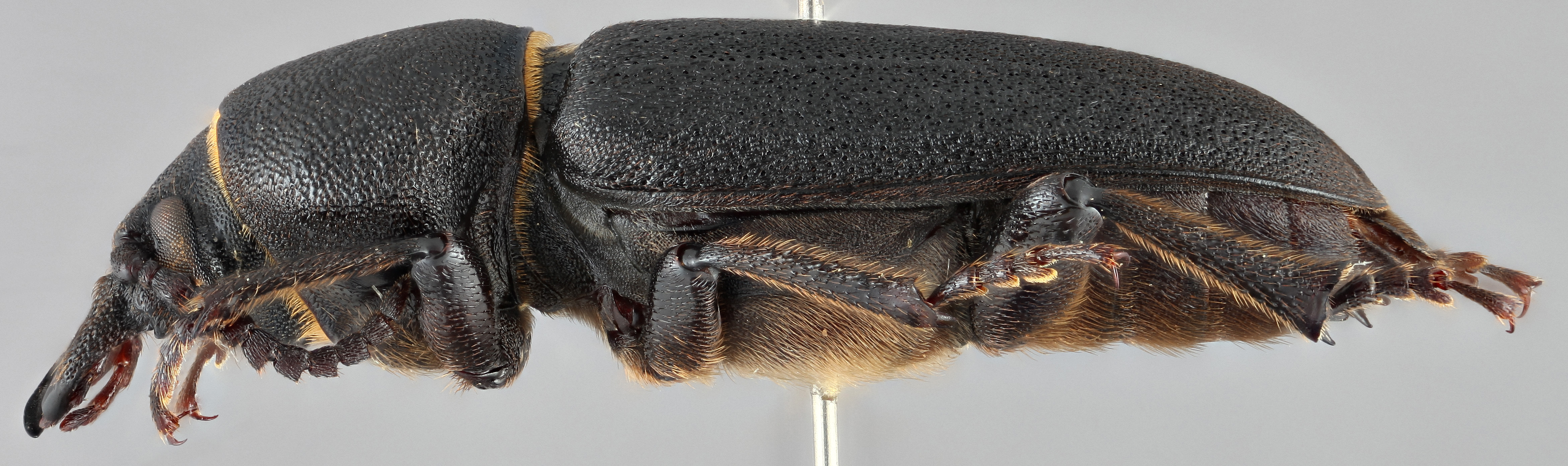 The non-transverse antennal segments, second antennal segment ½ the length of third, and black integument will distinguish from Scaphinus. The globose pronotumpronotum: