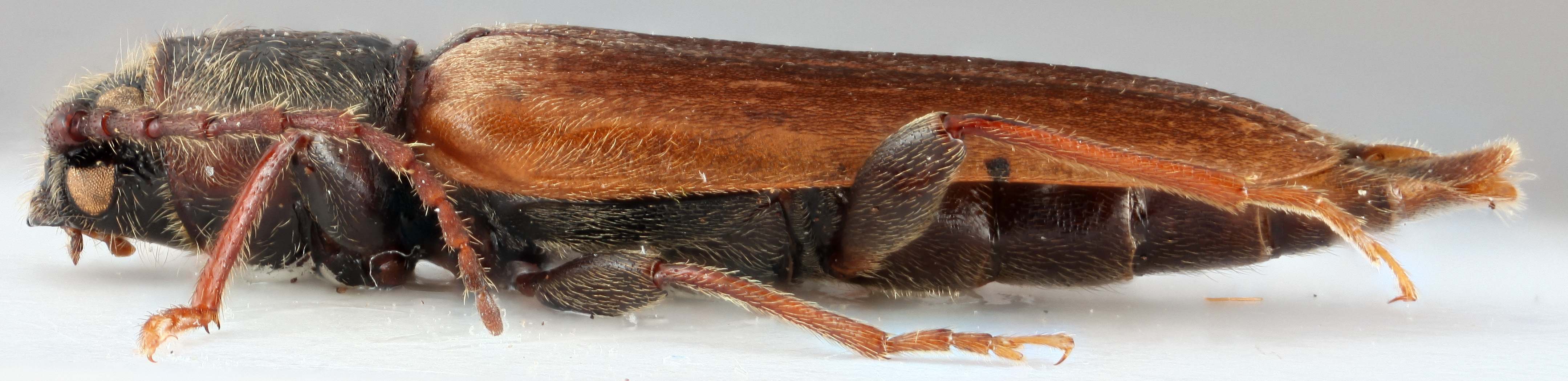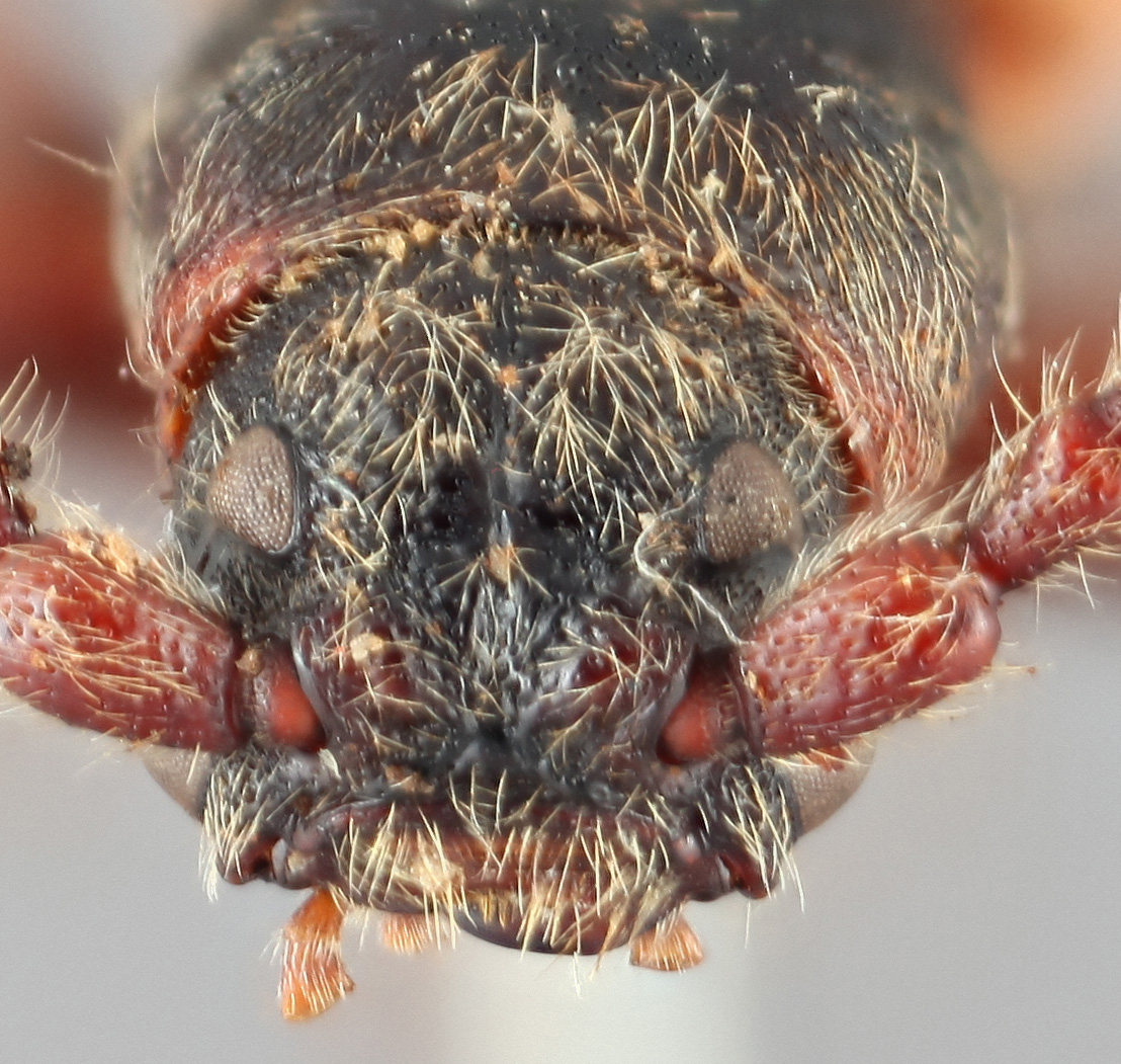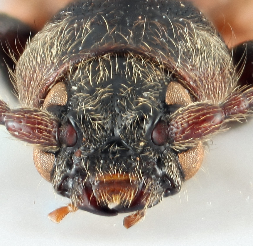 The divided eyes will separate Tetropium from other Spondylidinae except Atimia, which has closed procoxal cavities. Two tibial spurs, finely-faceted bald eyes, and open procoxal cavities will separate from look alikes.