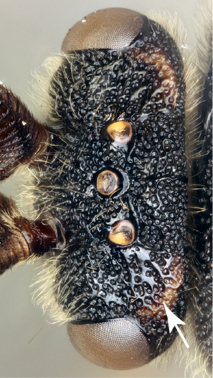 projecting lower than the distoventral corner. Diprion similis and D. pini are together distinguishable from all other Diprion spp. in the presence of occipital maculae.