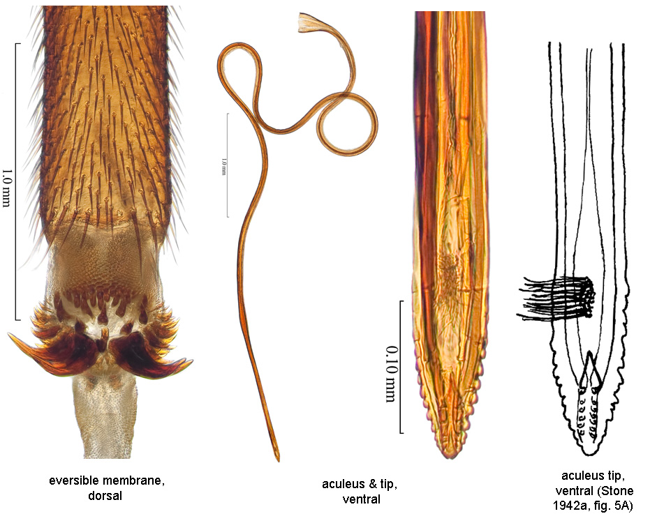 Abdomen. Abdomen ovate or parallel-sided, syntergite 1+2 gradually broadening or parallel-sided. Abdominal tergite without brown markings. Glans present; without spinules. Oviscape entirely yellow to orange brown, or at least apex brown (distal half darker but sometimes not distinctly); straight; length 4.2–4.5 mm. Eversible membrane with dorsobasal denticles all sclerotized, in continuous triangular to semicircular or suboval pattern. Eversible membrane with 25–35 denticles (hooklike denticles, mostly relatively small, but 4 in posterior row twice as large as others). Eversible membrane, subbasally on ventral side without cluster of hairs. Aculeus in ventral view convoluted. Aculeus tip lateral margins not curved dorsally; not flared outward at or proximal to base; without ridges or lobes; with minute serration, visible only with compound microscope, or with fine serrations. Aculeus tip serrations not extending onto dorsal side basally. Aculeus tip with serrations separated by less than width of serration.
