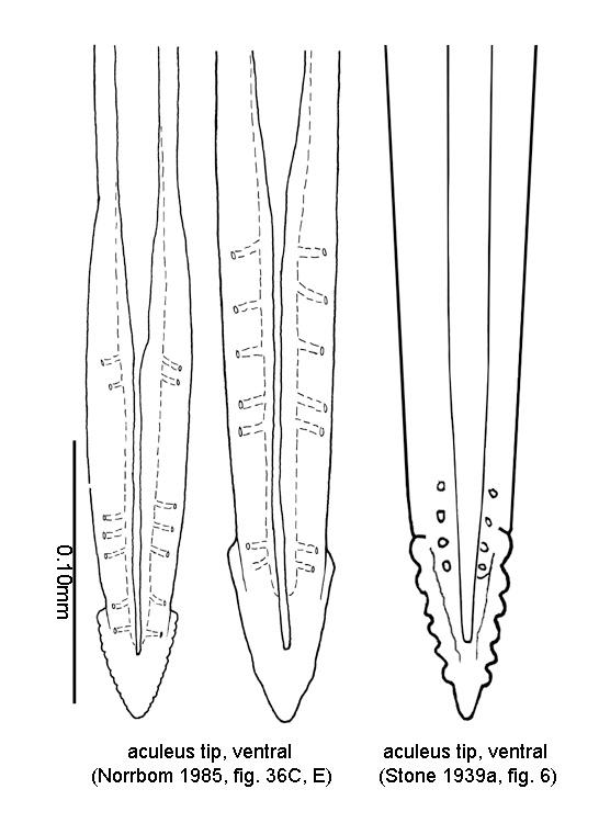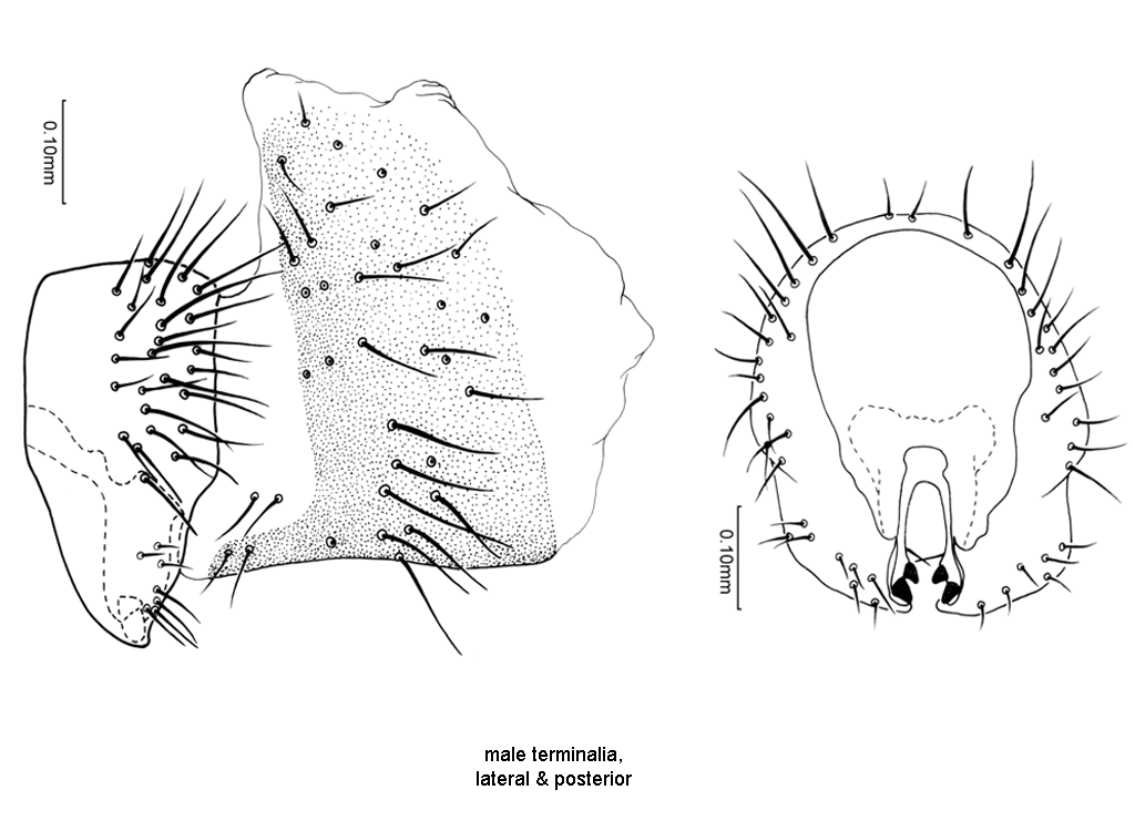 Abdomen. Lateral surstylus in posterior view very short, barely extended beyond prensisetae, rounded apically. Lateral surstylus in posterior view not boot-shaped. Glans absent. Oviscape length 4.6–6.1 mm (4.74–5.97, n=17); ratio (oviscape length/mesonotum length) 0.95–1.45 (1.03–1.39, n=17). Eversible membrane with dorsobasal denticles all small, weakly developed, in triangular to semicircular pattern. Aculeus length 4.2–4.95 mm (4.27–4.84, n=12). Aculeus length/oviscape length 0.75–0.95 (0.79–0.91, n=12). Aculeus in ventral view more or less parallel-sided except extreme base. Aculeus tip length/aculeus length 0.02–0.05 (0.031–0.039, n=8). Aculeus tip length 0.14–0.18 mm (0.145–0.171, n=8; difficult to measure, proximal limit of tip difficult to distinguish).