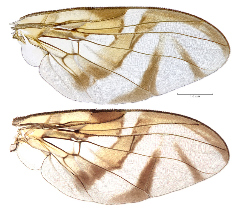 Wings. Wing length 5.25–6.6 mm (5.28–6.6, Stone 1942). Wing pattern typical Anastrepha pattern (S-band complete or at most interrupted at crossvein r-m, C-band and at least proximal arm of V-band present). Cell c mostly or entirely infuscated to subhyaline, or paler posteriorly, without distinct subapical hyaline area. C-band broadly extending to vein M in cell br along cell bm; covering base of cell r2+3; yellow or orange area posterior to pterostigma broad, extending distally into cells r1 and r2+3 at least to level of midlength of pterostigma. C-band and S-band connected (along vein R4+5, cell r1 with basomarginal hyaline spot). Basal hyaline area between C-band and S-band extended to vein R4+5. Cell r1 basomarginal hyaline spot triangular to quadrate. Cell r1 basomarginal hyaline spot apex aligned proximal to crossvein r-m. S-band extended anteriorly to vein R4+5 and covering all of crossvein r-m. Cell bm entirely hyaline or infuscated only along subapical fold. S-band base without extension in middle of cell cu1 to posterior wing margin; without extension in cell a1 to or almost to posterior margin. S-band middle section predominantly or entirely orange, often with brown margins. Subapical hyaline area in radial cells distal to r-m extending anteriorly to vein R2+3. S-band distal section without marginal hyaline band or spots in cell r2+3 or near apices of R2+3 or R4+5. S-band distally not extended to apex of vein M. V-band proximal arm as dark as apical half of S-band; extending more than 1/3 distance from apex of vein Cu1 to apex of vein A1+Cu2; not connected anteriorly to S-band; not connected to S-band in cell dm. V-band distal arm complete, or incomplete, not reaching vein R4+5, but extended from vein M to wing margin; isolated, not connected to proximal arm of V-band or to S-band, or connected to proximal arm of V band. Vein R2+3 not sinuous; without accessory vein. Crossvein dm-cu orientation with anterior end more distal than posterior end.