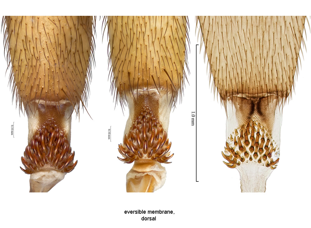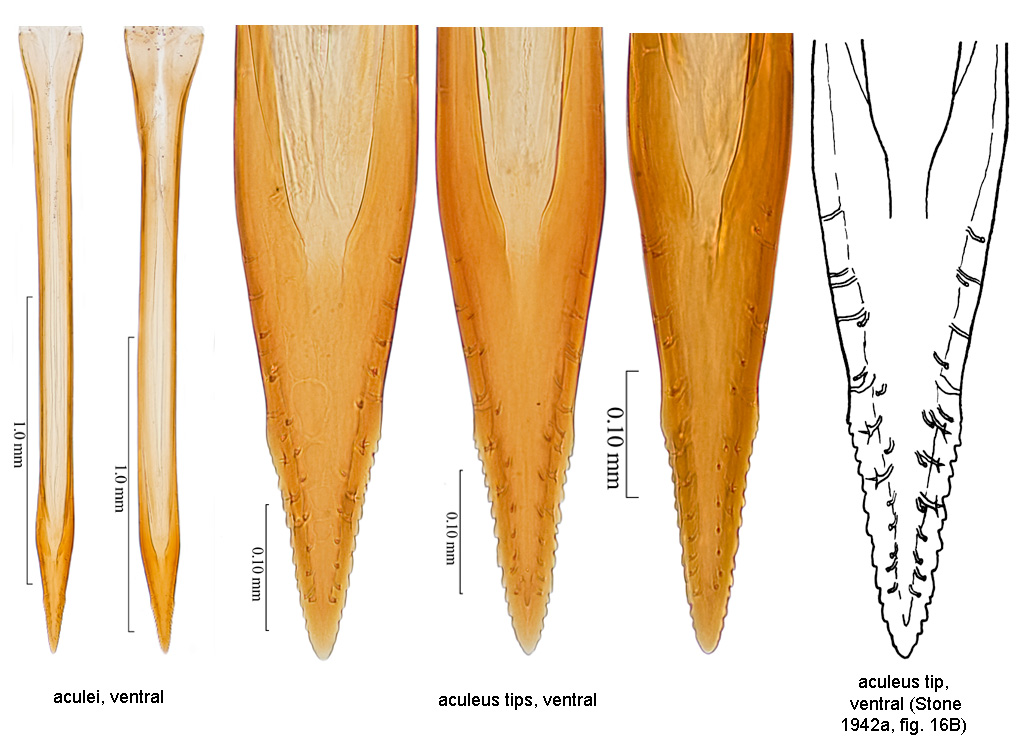 Abdomen. Abdominal tergite without brown markings. Glans present; without spinules. Oviscape length 2–2.3 mm (2.1–2.2, Stone 1942); spiracle ratio (distance from base to spiracle/oviscape length) 0.32–0.38 (0.34–0.36, Stone 1942). Aculeus length 1.6–2.2 mm (1.85–2.08, n=5; 1.9–2.15, Stone 1942; 1.60–1.92, Araujo & Zucchi 2006). Aculeus in ventral view more or less parallel-sided except extreme base. Aculeus in lateral view straight or ventrally curved. Aculeus tip length/aculeus length 0.15–0.17 (n=4). Aculeus tip length 0.29–0.37 mm (0.30–0.34, n=4; 0.30–0.37, Araujo & Zucchi 2006); width 0.12–0.15 mm (0.13–0.14, n=3); lateral margins not curved dorsally; not flared outward at or proximal to base; without ridges or lobes; without elongate dorsolateral depressions apically; with fine serrations, or with medium sized serrations; serrated part 0.45–0.65 times length of tip (0.50–0.58, n=4). Aculeus tip serrations not extending onto dorsal side basally. Aculeus tip with serrations separated by less than width of serration. Egg without lobe (Dutra et al. 2011a).