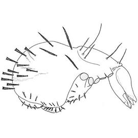 1-3 pairs of extrusible finger-like to button-like projections, usually retracted into in the genital vestibule of acariform mites; sometimes formed as sessile disks around the genital opening; thought to be osmoregulatory structures; modified or multiplied and dispersed over the body in many freshwater mites. Genital papillae are absent in the larva, but may be added ontogenetically: protonymphs have one pair, deutonymphs two pairs, and tritonymphs (and adults) three pairs. The tritonymphal pair of papillae is often lost. The serially homologous Claparède's organ is usually present in the larvae (and prelarvae) of mites exhibiting genital papillae in nymphs and adults (Oudeman's Rule).; 8 pairs of genital setaeseta:
