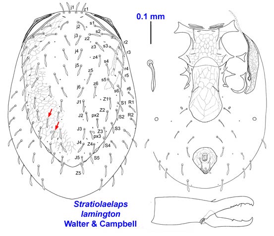 Superorder Parasitiformes » Order Mesostigmata » Suborder Monogynaspida » Infraorder Gamasina » Hyporder Dermanyssiae » Superfamily Dermanyssoidea » Family Laelapidae » Subfamily Hypoaspidinae » Tribe Pseudoparasitini » Genus Stratiolaelaps » Species Stratiolaelaps lamington