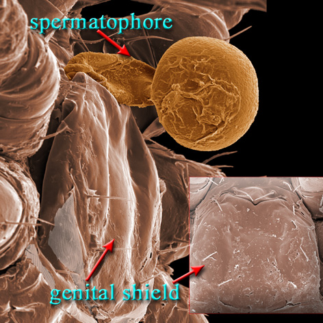teeth and the anal opening is small. Only fluids of prey are ingested. Males use their chelicerae to transfer a flask-shaped spermatophorespermatophore: