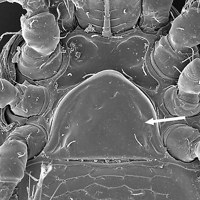 the sternum of the 3rd body segment (between legs I); produced as a biflagellate structure in Mesostigmata, although sometimes the flagellae (laciniae) are partially or completely fused.