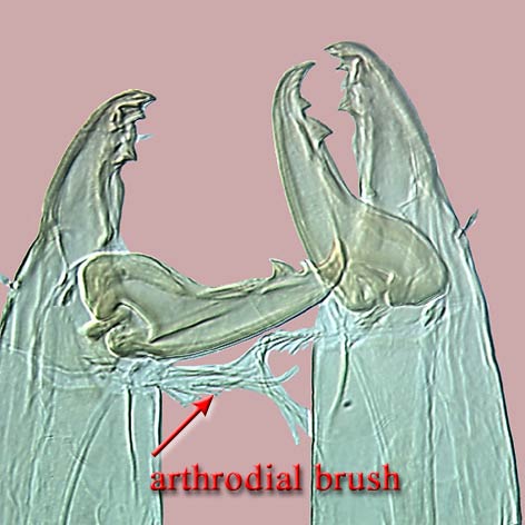 usually present in all stages. Chelicerae various; movable digit without excrescences except in Microgyniina, but arthrodial coronaarthrodial corona: