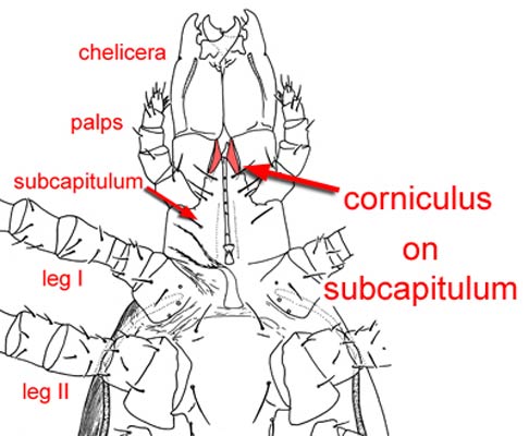 (pl. corniculi) (also, external malae) a usually horn-like process (sometimes toothed, bifurcate, trifurcate, spine-like, spatulate, or membranous) on the subcapitulum of parasitiform mites that usually supports the salivary styli. A toothed corniculus could be confused with a rutellum, a possibly homologous structure in Acariformes and Opilioacarida. Phytoseiid image is spatulate corniculus. horn-like, bifurcatebifurcate: