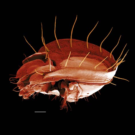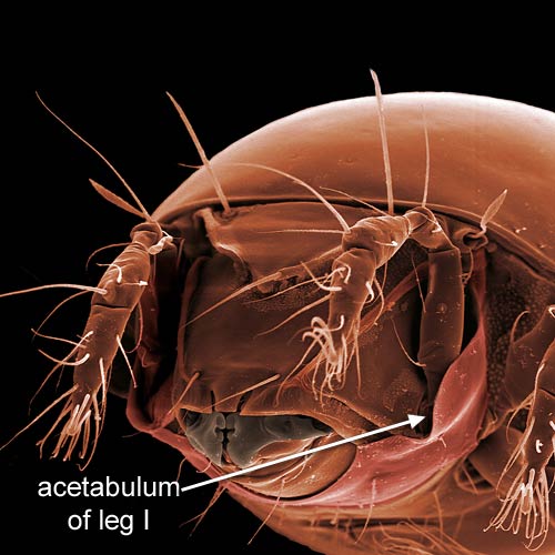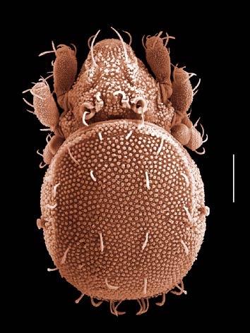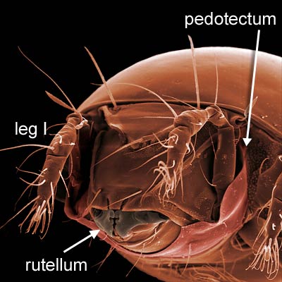 oribatid mites could be confused with other fully armored mites in the Prostigmata (Labidostommatides, Scutacaridae), Mesostigmata (Uropodidae, Ologamasidae, Eviphididae), or the hypopi of the Astigmatina, but none of these will have a single pair of prodorsal trichobothriatrichobothrium: