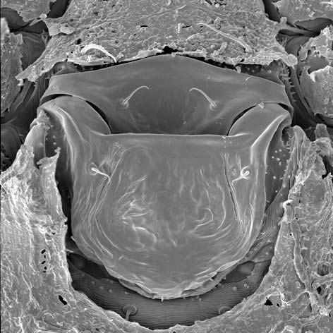 - Light tan to brown, oval mites with thick cerotegument, a truncate podonotal shieldpodonotal shield: