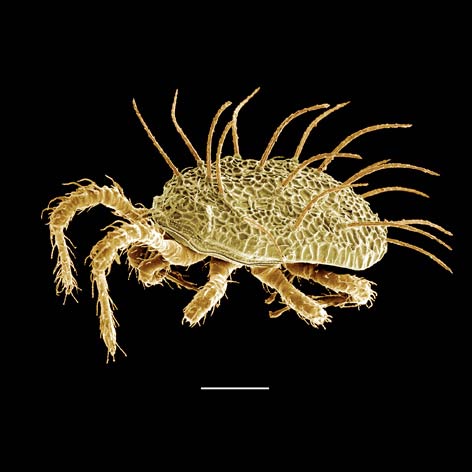 (= palp apotele, palptarsal claw) the most distal segment of the palp; absent in Acariformes, claw-like in Opilioacarida, and a subdistal, tined structure in the Mesostigmata. 2-tined.............................. Kleemannia