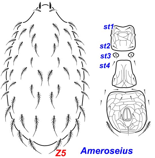 Ameroseius Berlese (including Kleemannia Oudemans =Primoseius Womersley, =Klemannia misspelling)—greater than 30 spp.; dorsaldorsal: