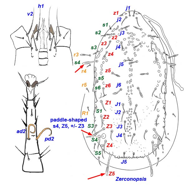 the use of setal position and form in taxonomy; see Lindquist-Evans system, Grandjean system, Rostral-lamellar system, etc.