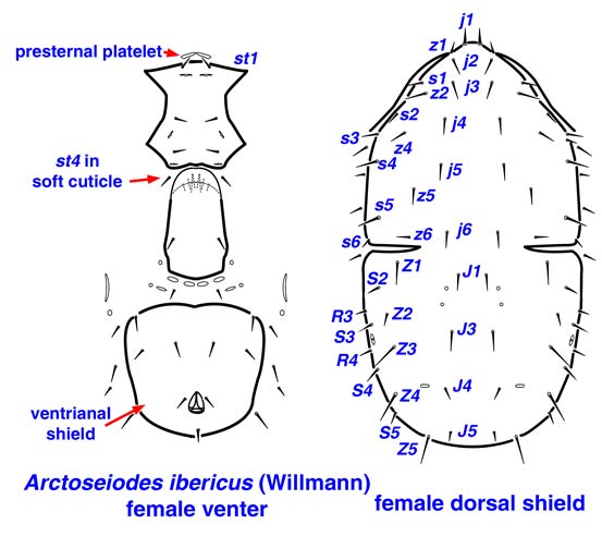 III with 7 setae (pv1 absent); female with anal shield bearing only circum-anal setae (rarely with ventral setaeventral setae: