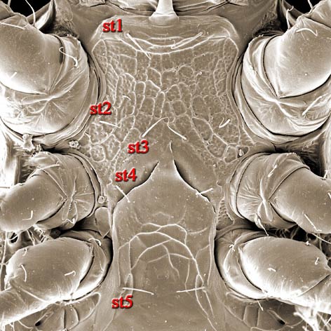 the sternum of the 3rd body segment (between legs I); produced as a biflagellate structure in Mesostigmata, although sometimes the flagellae (laciniae) are partially or completely fused.