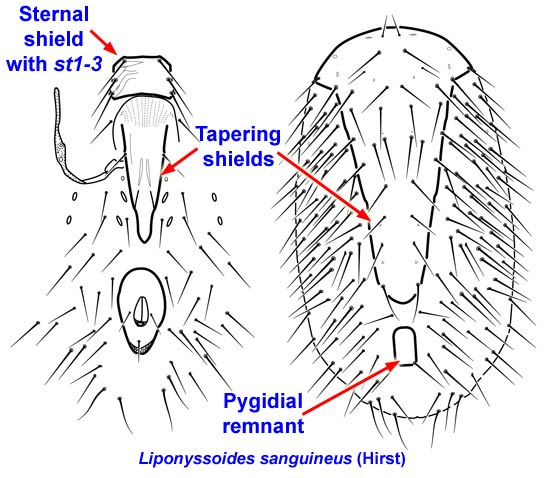 Blood-feeding parasites of vertebrates. Liponyssoides sanguineus (Hirst) feeds on mice, and to a lesser extent other rodents, and is a known vector of rickettsial pox.