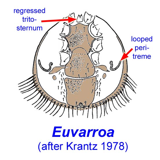 Superorder Parasitiformes » Order Mesostigmata » Suborder Monogynaspida » Infraorder Gamasina » Hyporder Dermanyssiae » Superfamily Dermanyssoidea » Family Varroidae » Genus Euvarroa