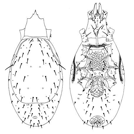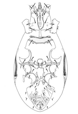 Species of Proarctacarus have a very short podonotal shield and a series of small mesonotal platelets. Laelapidae (Hypoaspis, Gaeolaelaps), Parasitidae, Veigaiidae all are somewhat similar in form to Arctacarus, but none have the posteriorly truncate dorsal shield, lazy-8 pygidium, and bifurcate pilus dentilis, nor males with a mid-coxal genital opening.