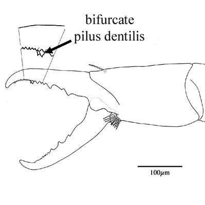 (pl. pili dentilis) a seta-like or membranous sensory organ inserted ventrolaterally on the fixed digit of the chelicera of many Mesostigmata.
