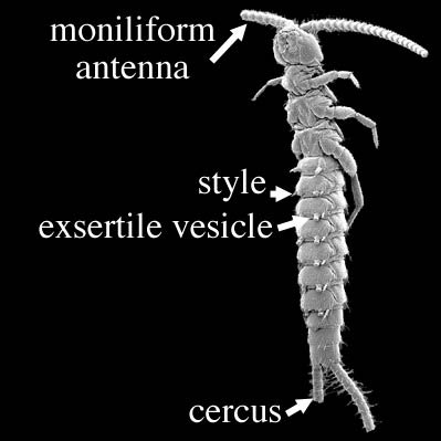 Distinguishing features: long moniliform antennae; long, many segmented pair of cerci or single-segmented pincer-like cerci; eyes absent