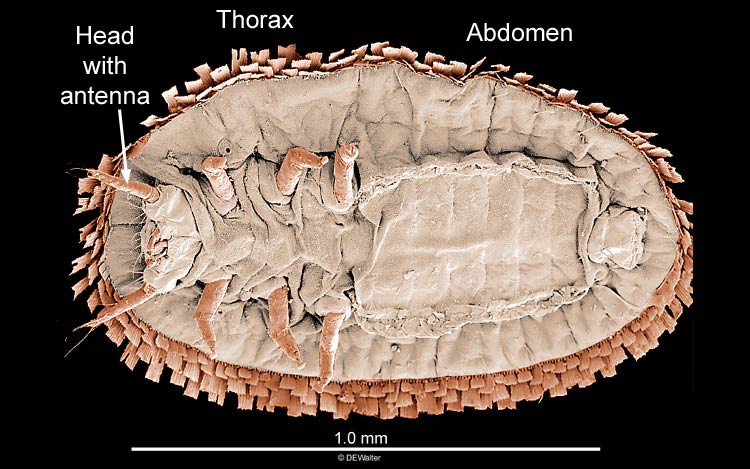 in some (e.g., scale insect crawlers). Insects can usually be distinguished from mites by their antennae, compound eyes, wings, or clear segmentationsegmentation:
