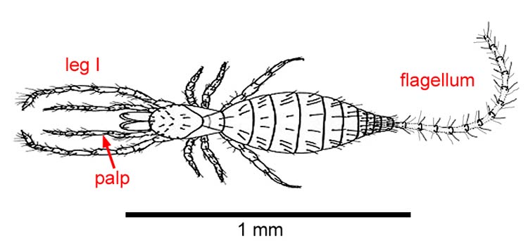 Small size, strong chelicerae; somewhat mite-like when the flagellum breaks off (common), but with clear opisthosomal segmentationsegmentation: