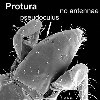 Comments: Proturans lack antennae, but have antenniform front legs. Their abdomens are long and composed of numerous segments (added developmentally). The first 3 segments have small styli, but no collophore or furcula is present. They are common in soil and humus, especially in forest systems.