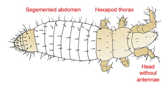 tagmata: head, thorax, abdomen (9–12 segments, styli on S1-3, cerci absent)