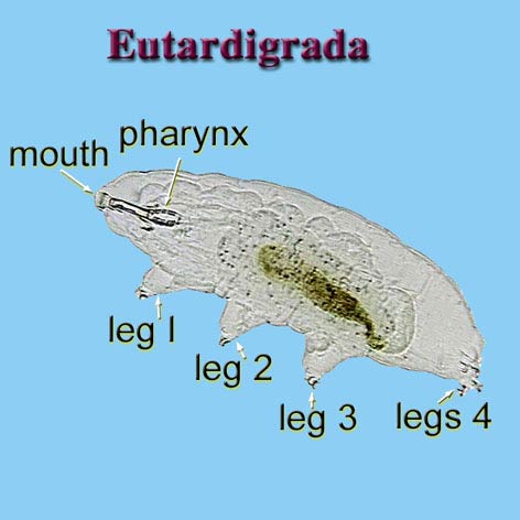 Comments: Tardigrades are commonly known as 'water bears', presumably because of their large claws and ursine build, or perhaps because of their teddy bear-like aspects. Tardi-grade means 'slow walk', an apt description of their movement. Most tardigrades have short, cylindrical bodies with either a smooth integument that lacks armor (Eutardigrada) or a series of armored plates (Heterotardigrada). Some, particularly marine species, have large spines or bodybody: