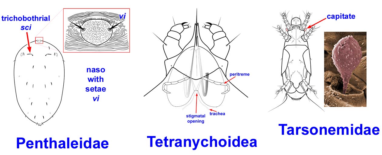 The Tetranychoidea never have a naso, but do have peritremes, a pair of segmented gutters that lead to the stigmatal openings between the chelicerae. The peritremes may be difficult to see when the stylophorestylophore: