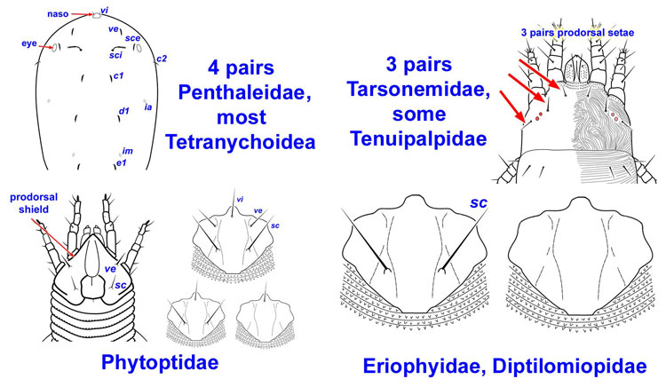 Members of the Tetranychoidea usually have the basic 4 pairs of prodorsal setaeprodorsal setae: