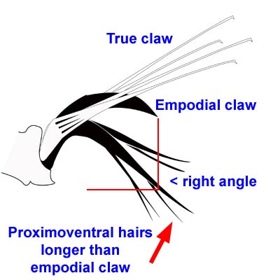 is split distally into 2–3 pairs of 'proximoventral hairs' but usually an empodial clawclaw: