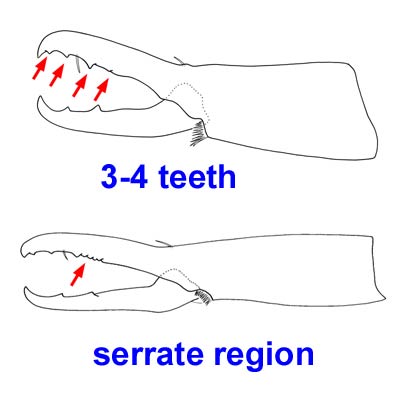 has either 3–4 teeth and a shear-like region or two teeth before the pilus dentilispilus dentilis: