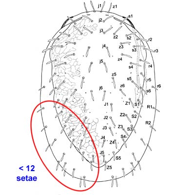 is exposed soft cuticle. In most species, this soft cuticle bears seta r6 and less than a dozen setae in the Marginal (R-) and Submarginal (UR-) series. Additionally, 9 pairs of setae are usually present in the Ventralventral: