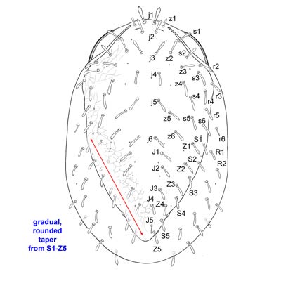 that exposes much of the opisthonotum. The easiest character for recognizing the most commonly encountered species of Stratiolaelaps, S. scimitus (often marketed under the misnomers S. miles or Hypoaspis miles) is the sharp taper of the dorsaldorsal: