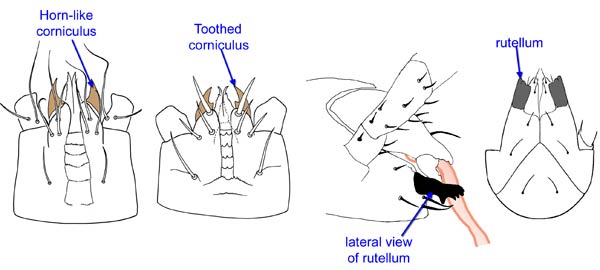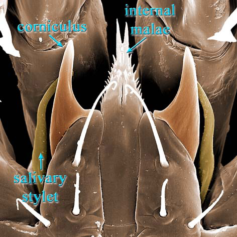 (pl. corniculi) (also, external malae) a usually horn-like process (sometimes toothed, bifurcate, trifurcate, spine-like, spatulate, or membranous) on the subcapitulum of parasitiform mites that usually supports the salivary styli. A toothed corniculus could be confused with a rutellum, a possibly homologous structure in Acariformes and Opilioacarida. Phytoseiid image is spatulate corniculus. are toothed and look more like rutellarutellum: