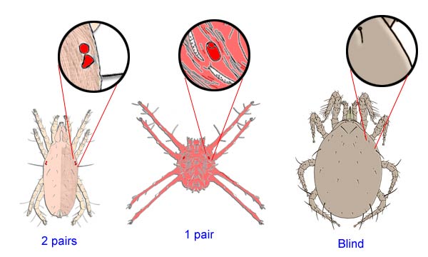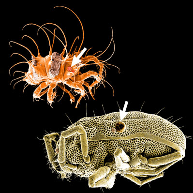 Eyes are common in the Prostigmata, Endeostigmata, and Opilioacarida, but absent in all Mesostigmata and in most oribatid mites, Astigmata, and ticks. In some Prostigmata (e.g., velvet mites with dense pelages of fur), the eyes may be raised on stalks (Fig. 3) and in many the posteriorposterior:
