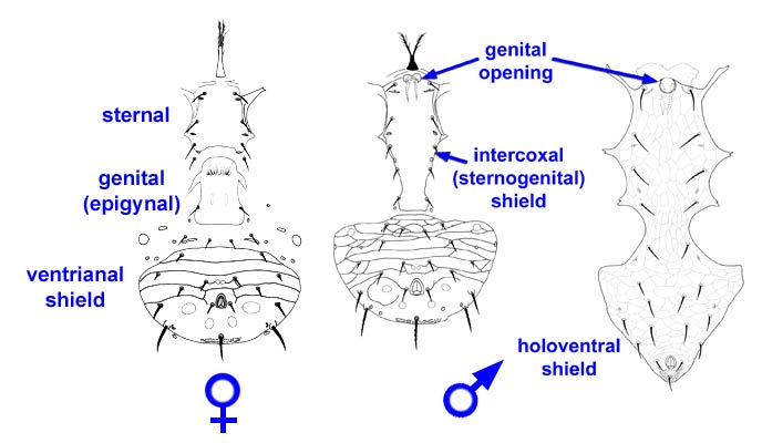 ventral region. Adult males and immature stages of both sexes have a