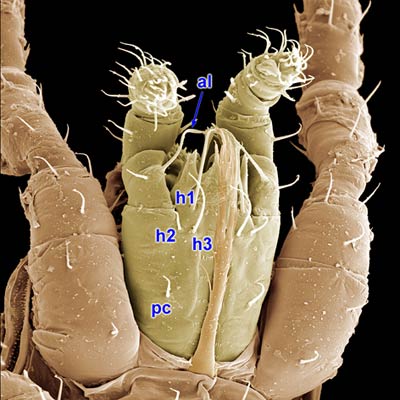 In Platyseiidae and some Arctoseiinae (Ascidae), both the internal palptrochanteral seta (al) and the anterior hypostomatal seta (h1) are elongate, curled and whip-likewhip-like: